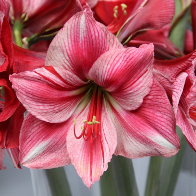 Амариллис простой Гервазе - это удивительное растение, которое поразит вас своей необычной окраской цветков. На белых лепестках расположены вишневые полосы и ярко-красные штрихи, создавая удивительный и неповторимый образ. Каждый цветок на стрелке уникален, не повторяется ни один другой. Высота растения достигает 35-40 см, а размер цветка составляет 15-17 см. Листья имеют интересную форму, что делает амариллис еще более привлекательным.