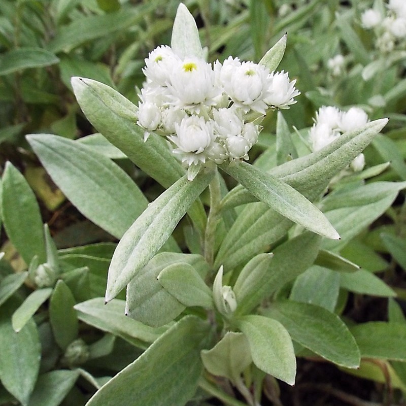 Семена и рассада анафалиса трехжилкового отлично подходят для оформления каменистых горок, южных склонов, террас и создания сухих садов. Растение представляет собой стебель высотой до 50 см, на котором формируются продолговатые листья с войлочной поверхностью. Верхушку многолетника украшают соцветия-щитки. Они состоят из серебристо-серых корзинок, окруженных мелкими белыми листочками.