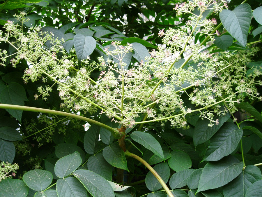 Саженцы Аралии высокой (Aralia elata) – быстрорастущее лиственное дерево или кустарник высотой до 3 м. Форма кроны и крупная сложно-перистая листва напоминает тропические культуры. Поэтому растение интересно и необычно смотрится в любых древесных композициях, а также как самостоятельное украшение садов и парковых зон. Окраска листвы Aralia elata зеленая. В период цветения, которое приходится на июнь, дерево покрывается соцветиями мелких белых цветов со слабым приятным ароматом. В первые 5-6 лет после посадки культура не цветет. Ветвистая система развивается только при повреждениях ствола. Чаще аралия высокая растет прямо.