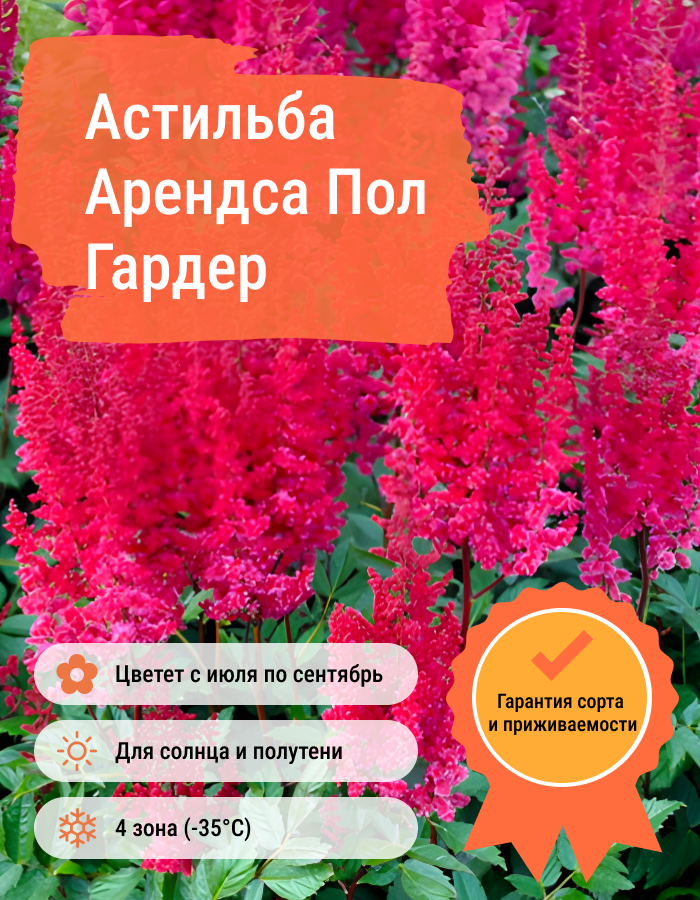 Саженцы Астильбы Арендса Паул Гардер (Paul Gaarder) образуют компактное, но пышное растение, высотой около полуметра. Темно-зеленая блестящая листва обрамляет тонкие, но прочные цветоносы, увенчанные метельчатыми соцветиями, длиной до 25 сантиметров. Цветки бордово-вишневого цвета, мелкие, имеют длинные тычинки, придающие цветам дополнительный объем.