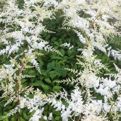 Рассада астильбы гибридной Юник Уайт (Younique White): тонкое и изящное травянистое растение с тонкими белыми соцветиями на невесомых поникающих побегах. Листва мелкая, темно-зеленая, с резными краями. Цветки посажены очень плотно, поэтому соцветия кажутся покрытыми белым инеем. Период цветения июль-август, затем на цветоножках завязываются семена.