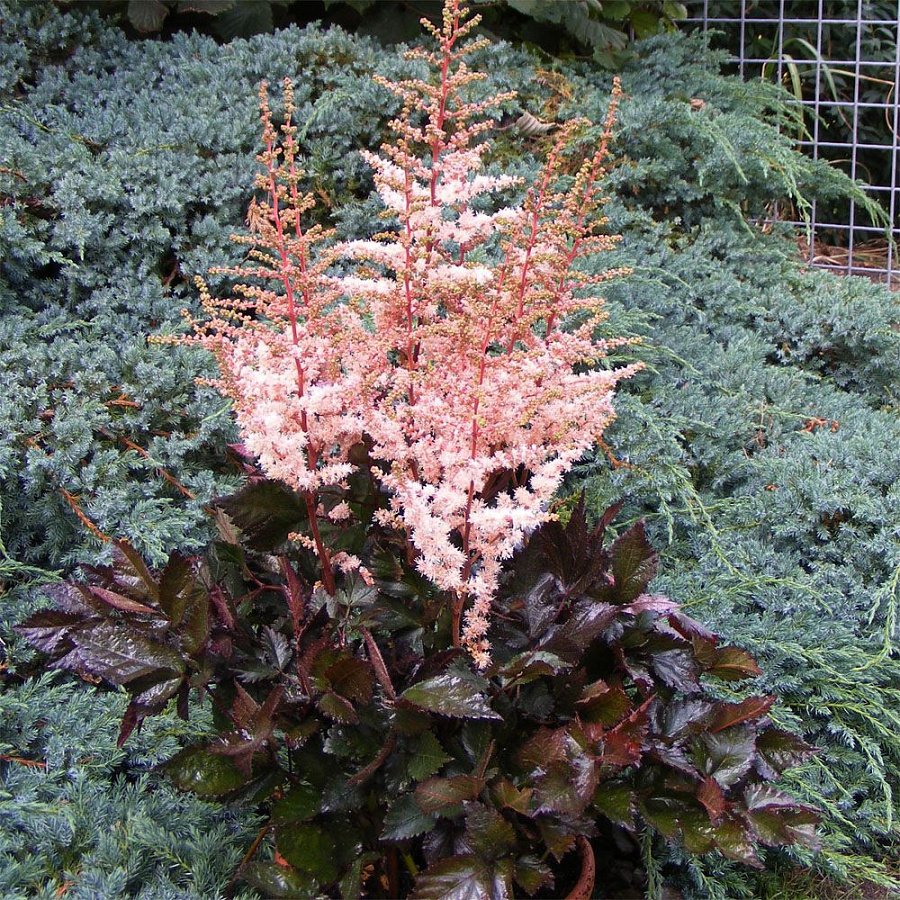 Рассаду астильбы "Спотлайт" (Spotlight) рекомендуется сажать на участках, защищенных от полуденного солнца, в легкой тени и полутени с северной стороны зданий, около водоемов или фонтанов, где повышенная влажность воздуха благоприятно влияет на их рост и развитие. Рассаду астильбы "Спотлайт" лучше всего растет на рыхлых, слабокислых суглинках. Листья темные, пурпурно-зеленые. Высота многолетника достигает до 60 см. Цветки кремово-розовые, собраны в изящные метелки. Период цветения - июль, август.