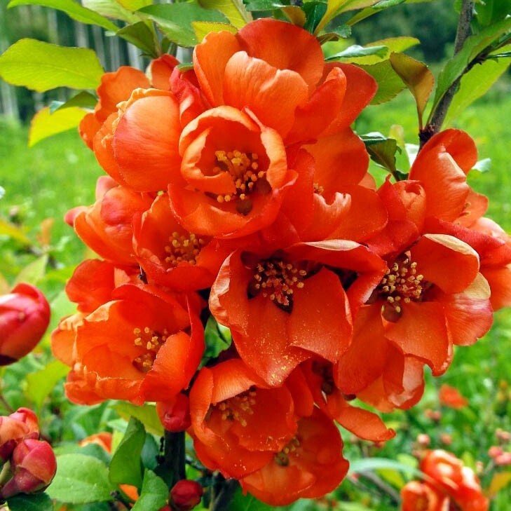 Саженцы айвы (хеномелес) превосходной Оранж Трэйл (Orange Trail) сформируют цветущий куст с привлекательными оранжево-красными соцветиями. Обильно цветет в мае и в этот период еще необлиственные побеги практически полностью усыпаются яркими цветочками. К достоинствам сорта можно отнести возможность повторного цветения в августе. А в сентябре уже появляются первые плоды с характерным ароматом.