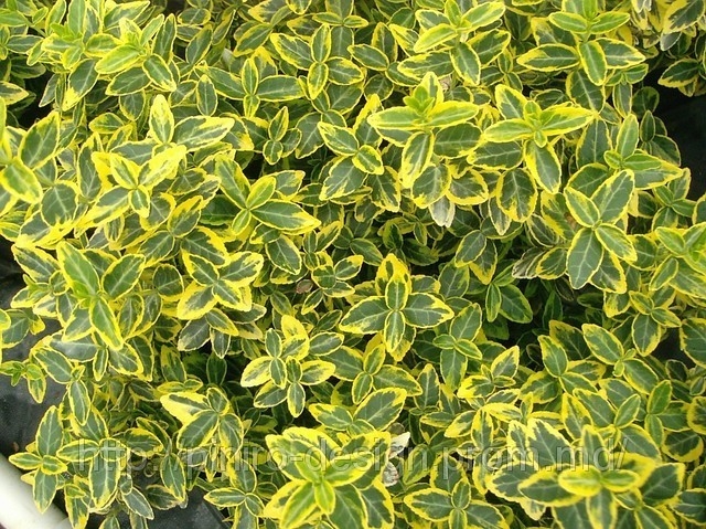 Уникальность сорта в его пестрых зеленых яйцевидных листьях с желтой каймой, которая в осенне-зимний период приобретает розоватый окрас. Цветет кустарник в июне-июле белыми цветками.