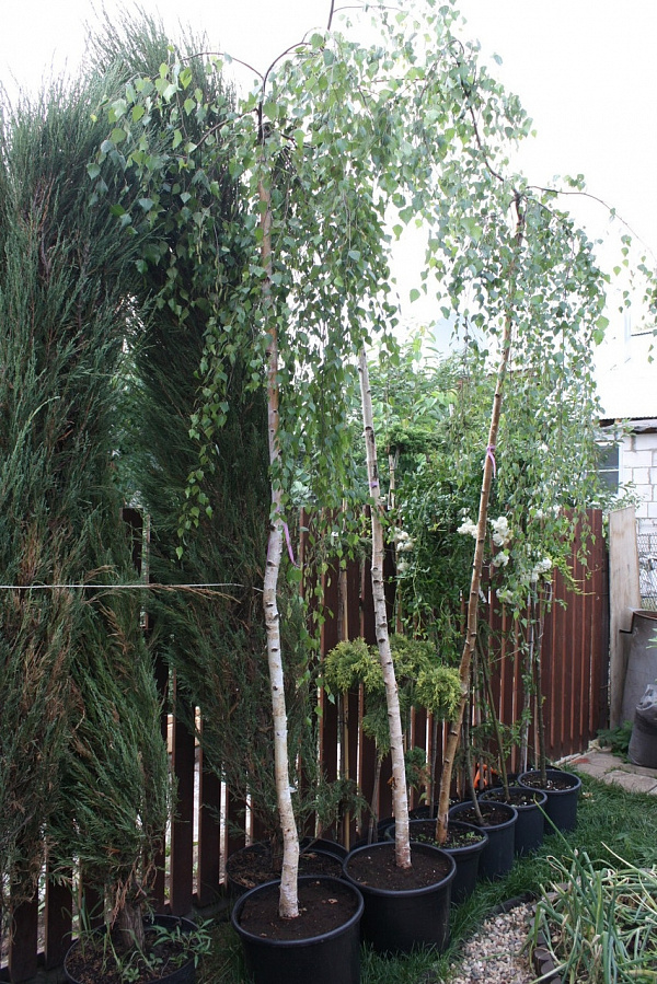 Саженцы Берёзы повислой Янги на штамбе (Betula pendula) – лиственное дерево. Его высота зависит от высоты штамба. В среднем – 250 сантиметров. Крона зонтикообразная, сформирована из тонких ветвей плакучей формы, диаметром около 150 сантиметров. Ежегодный прирост не более 8 сантиметров. Сорт Янги на штамбе популярен у садоводов благодаря своим плакучим веткам, спускающимся до земли. Листья его остро-яйцевидной формы зеленого окраса. Цветет в мае цветками светло-зеленого тона в виде сережек длиной до 7 сантиметров. Кора белая. Дерево неприхотливо. Может произрастать в контейнерах. Без труда переносит даже длительно увлажненную почву. Хорошо себя чувствует на открытой местности и в полутени. Не боится морозов.