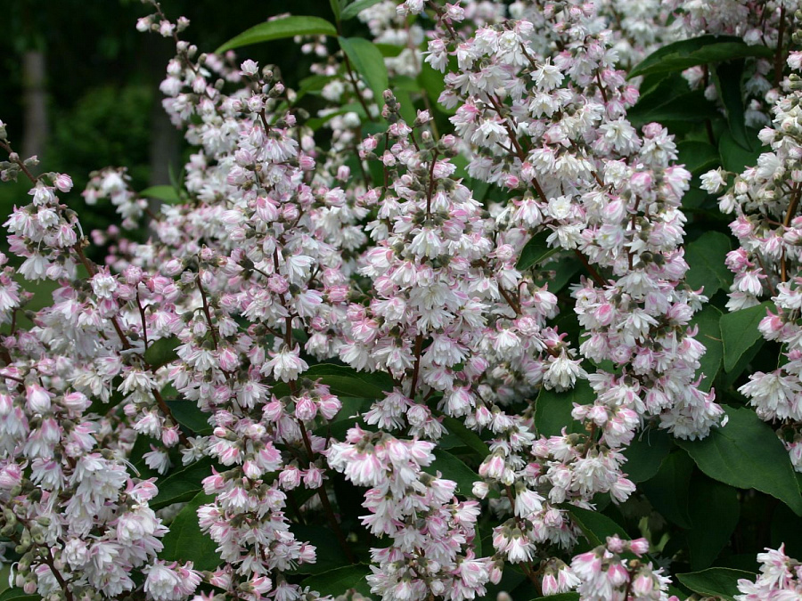 Саженцы дейции Плена (Plena) вырастают небольшим кустиком около 1 метра в высоту с прямыми, прочными стеблями. Листва ланцетно-продолговатая, насыщено-зеленого окраса. Цветет в июне-июле ширококолокольчатыми, махровыми цветочками, которые собраны в плотные пучки. Цветение густо покрывает стебли, что выглядит неповторимо. Достоинства дейции Плена (Plena):