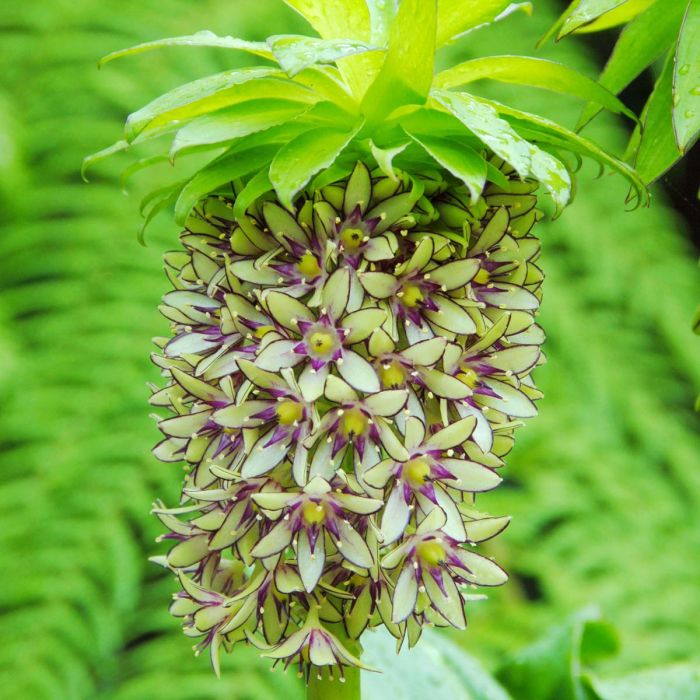 Луковицы Эукомиса Осеннего Биколор (Bicolor) высаживают в просторные вазоны или в открытый грунт. Это оригинальное растение формирует пышную розетку удлиненных гладких листьев и цветоносы высотой 50 сантиметров. Соцветие цилиндрическое, состоит из множества цветков – звездочек с длинными тычинками, на макушке имеется несколько коротких листьев, напоминающих задорный хохолок. Лепестки зеленовато-кремовые, окантованы ярко-пурпурной полоской. Цветение наступает в конце августа – сентябре.