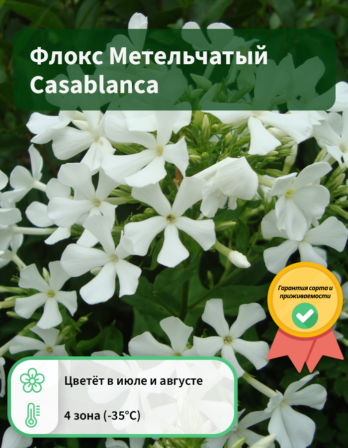 Флокс сорта Casablanca (Касабланcа) отличается чистым белым оттенком цветков. Соцветия большие и ветвистые смотрятся ажурными. Кустарник сильный с большим количеством стеблей, выглядит эффектно, хорошо переносит плохую погоду и быстро растет. Для него характерно долгое цветение. Главное условие красоты растения – это простор. Остальной уход предполагает несильное рыхление грунта, окучивание для ускорения формирования и укрепления корней, внесение органических удобрений и минералов. Цветам требуется регулярный и умеренный полив по утрам и вечерам. Губительно поливать корни холодной водой, так как это может спровоцировать растрескивание стеблей.
