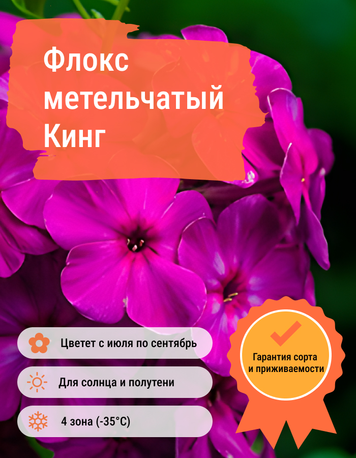 Рассада флокса Зе Кинг (The King) отлично подходит для выращивания цветов на срезку в букеты или просто в качестве украшения территории. Высота стеблей достигает 90 см, но при этом куст хорошо сохраняет форму. Этот сорт высоко ценится любителями необычных расцветок, так как оттенки лепестков варьируются от темно-лилового до лилово-пурпурного и прекрасно сочетаются со светлыми растениями. Серединка цветка всегда имеет более светлый тон, а в сумерках флокс Зе Кинг приобретает синеватый цвет. Семена этого сорта неплохо выдерживает небольшие заморозки, но при высадке в умеренном климате лучше прикрывать грунт.