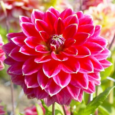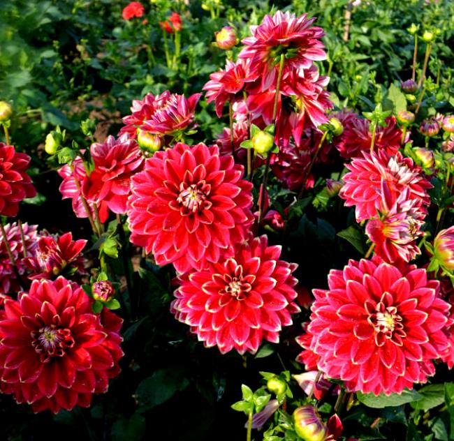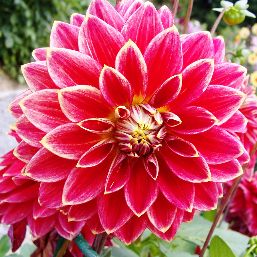 Георгин Мр. Оптимист неприхотлив к погодным условиям. До поздней осени привлекает внимание ярко-красными цветами с белоснежной каемкой на лепестках. Цветок сформирован в форме шара, овальные лепестки придают дополнительных штрихов в его очертании.