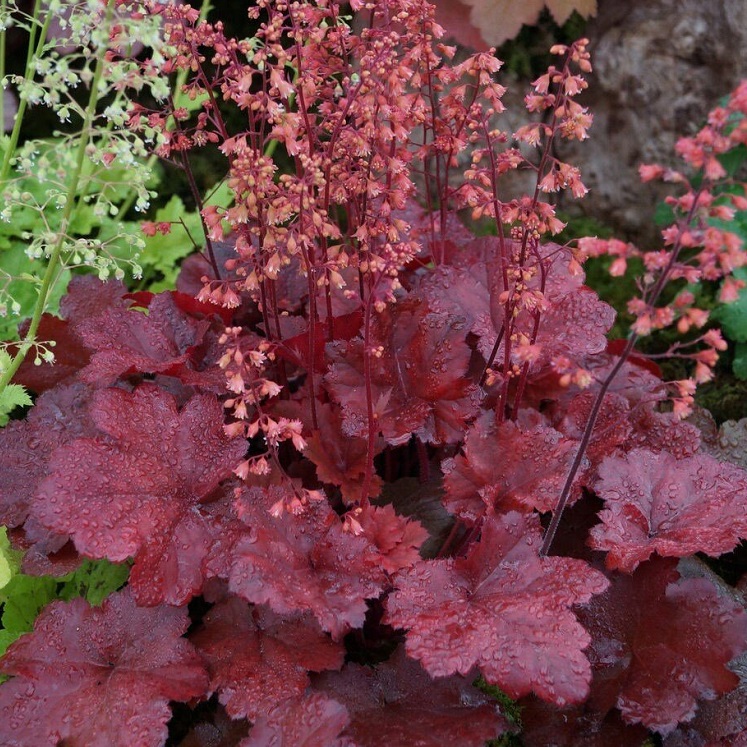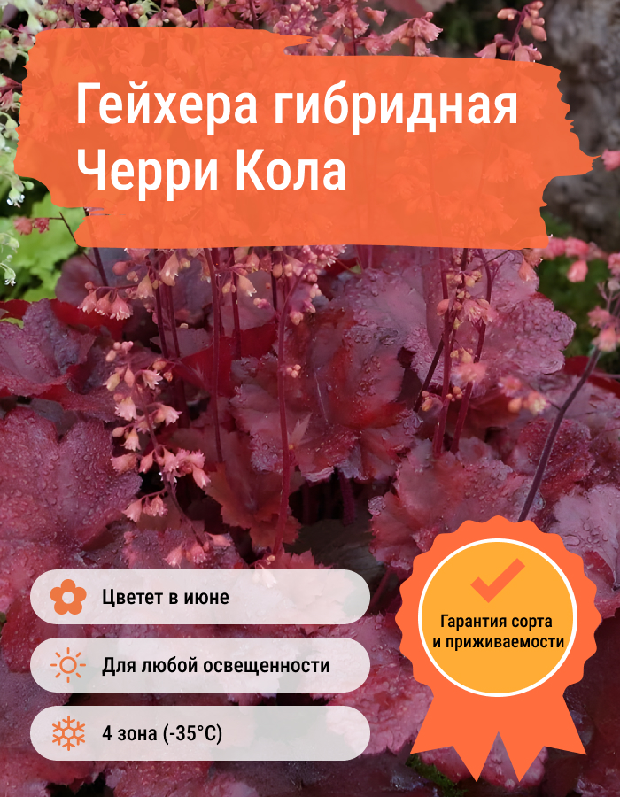 Рассада гейхеры Черри Кола (Cherry Cola) известна своими декоративными листьями. Их яркий вишнёвый цвет с тёмными прожилками и дал название сорту. Гейхеры зимостойкие растения, могут выдерживать морозы до -30°С. Самое чувствительное место у них – корни, они не могут расти в переувлажнённой почве. Поэтому гейхеру надо поливать не часто. Семена хорошо прорастают при освещении, при посадке же рассады надо, наоборот, выбрать места, защищённые от прямых солнечных лучей. Характеристика сорта Cherry Cola: многолетний куст; высота: 35-40 см; период цветения: июнь; окрас цветов: красный.