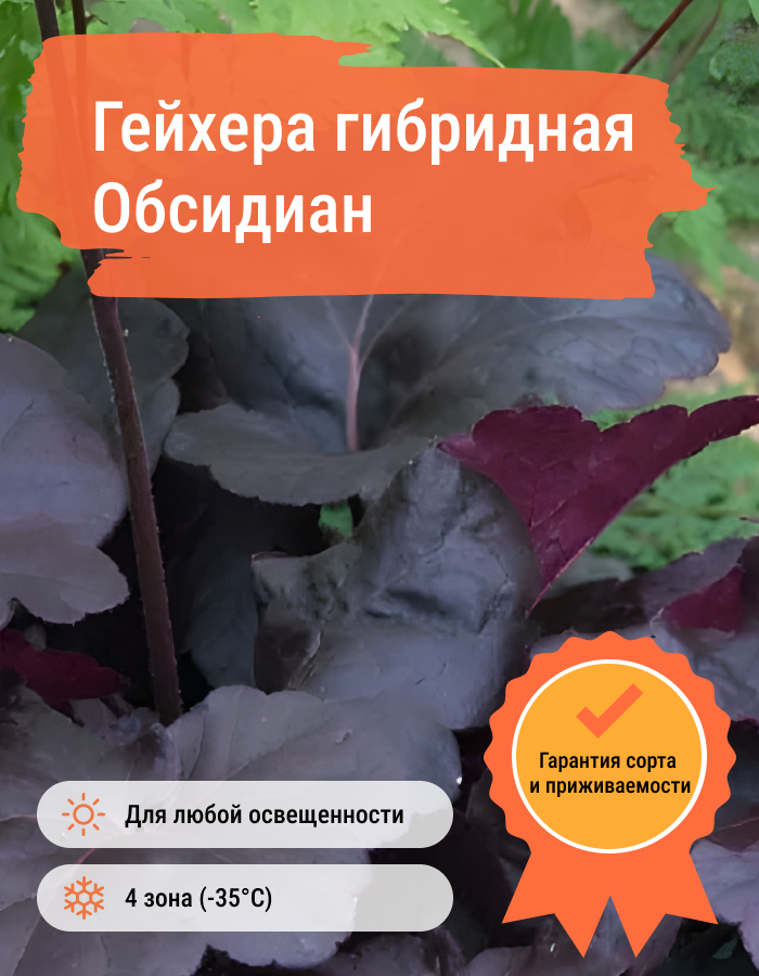 Рассада гейхеры Обсидиан (Obsidian) сделает акцент на любой клумбе. Все это благодаря своим листьям темно-бордового практически черного цвета. Напоминают они атлас. И даже при солнечном свете не меняют свой окрас . Растет высотой до 30 см, а в диаметре 60 см. Цветет золотистыми, мелкими цветами. Плюсы растения: