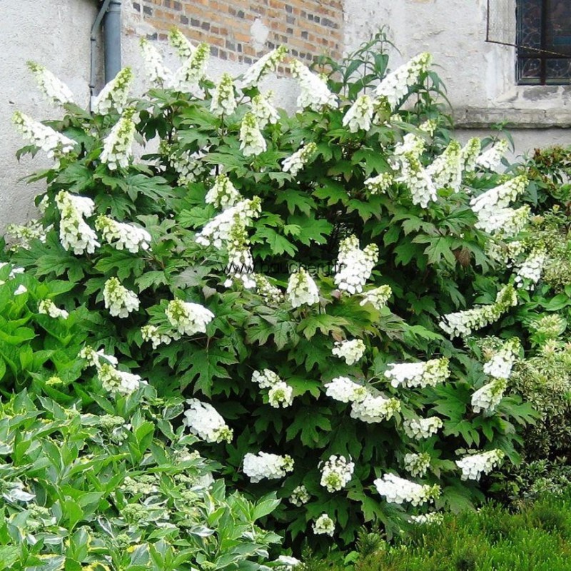 Саженцы гортензии Сноу Квин (Snow Queen) имеют лопастную, широкую листву и вырастают раскидистым кустом с красновато-войлочными побегами. Листики очень напоминают листву дуба и становятся осенью ярко-оранжевыми или бордовыми. Цветет белыми цветочками, которые немного возвышаются над кроной и собраны в свечевидную форму. Плюсы гортензии Сноу Квин: