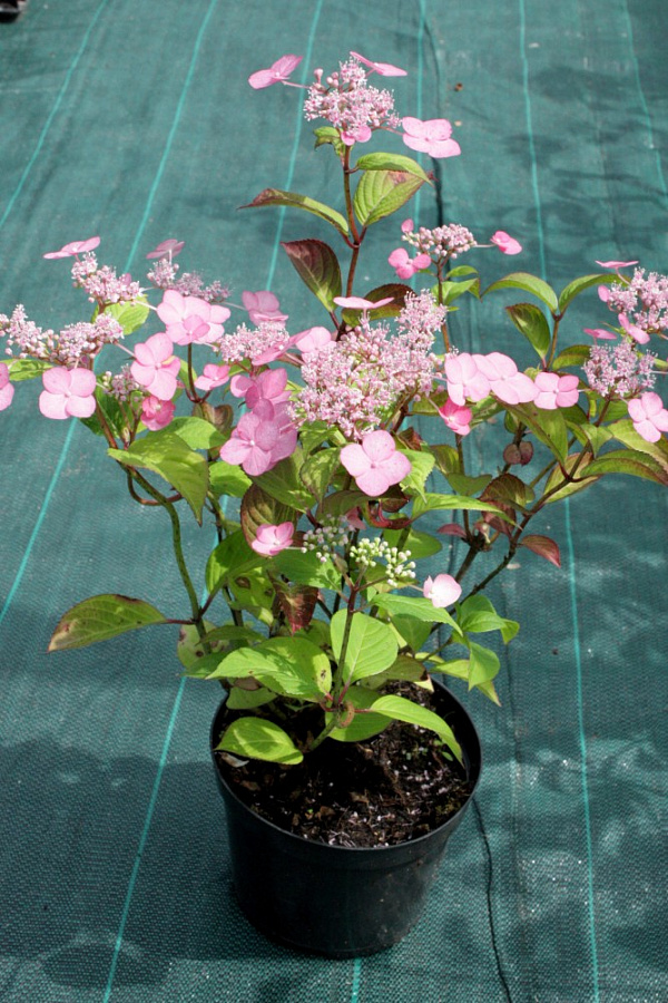 хорошо переносит полутень. Крупномеры рекомендуется пересаживать с земляным комом, так они лучше приживаются. Цветочки сдвоенные кружевные, оттенок меняется от розоватого до карминно-красного за период продолжительного цветения. При распускании листва гортензии пильчатой Сантьяго (Santiago) бронзово-зеленая, но к осени она становится практически красной.