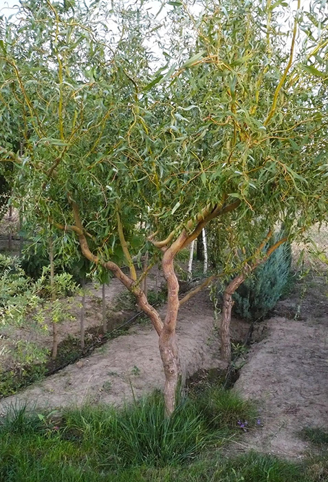 Дерево или кустарник до 4,0 м в высоту с шаровидной густоветвистой кроной. Побеги извилистые, серо-зелёные, с лёгким сизоватым налётом. Листья сверху светло-зелёные с серебристым отливом, снизу светлее из-за серовато-серебристого опушения. Саженцы ивы Korall (Коралл) дают дополнительные корни за короткий промежуток времени, поэтому вырастают они очень быстро, особенно, если интенсивно питать их влагой. Лучше всего они приноровятся у пруда, озера, ручья и т. д., но для среднего роста подойдет и обычная рыхлая и хотя бы немного влажна почва. Отличительные признаки: