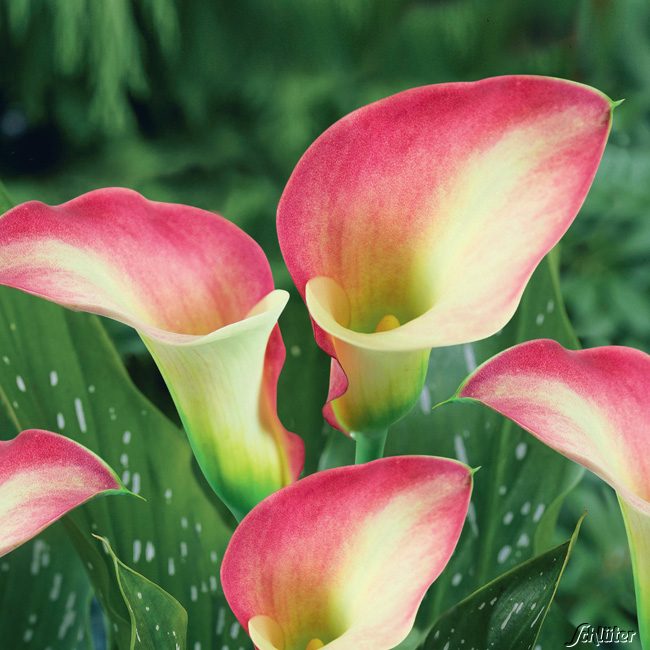 Луковицы Каллы гибридной Парфейт (Parfait Calla) с очаровательным цветком, которому под силу замедлить ход времени. Он имеет гармоничную расцветку — персиково-желтое покрывало обрамлено темно-розовой каймой. Листья темно-зеленого цвета. По ним разбросаны в хаотичном порядке белые точки и штрихи. Растение не имеет запаха. Оно не переносит сквозняков и пересыхание земляного грунта. При выращивании цветка в качестве комнатной культуры, следят, чтобы вода всегда оставалась в поддоне. В саду для него подыскивают место в низине или высаживают около кустарников и деревьев, которые защищают его от палящих лучей.