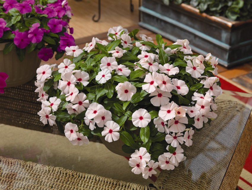 Ампельный катарантус сорта Cora Cascade Peach Blush - это настоящая находка для цветоводов, желающих создать великолепные групповые посадки в своем саду. Это растение порадует вас бело-розовыми цветками диаметром 4-5 см, которые будут радовать вас своим блеском и изяществом в течение нескольких месяцев в году. Высота этого красавца составляет 15-20 см, что делает его идеальным для украшения вертикальных поверхностей или создания живых занавесок.