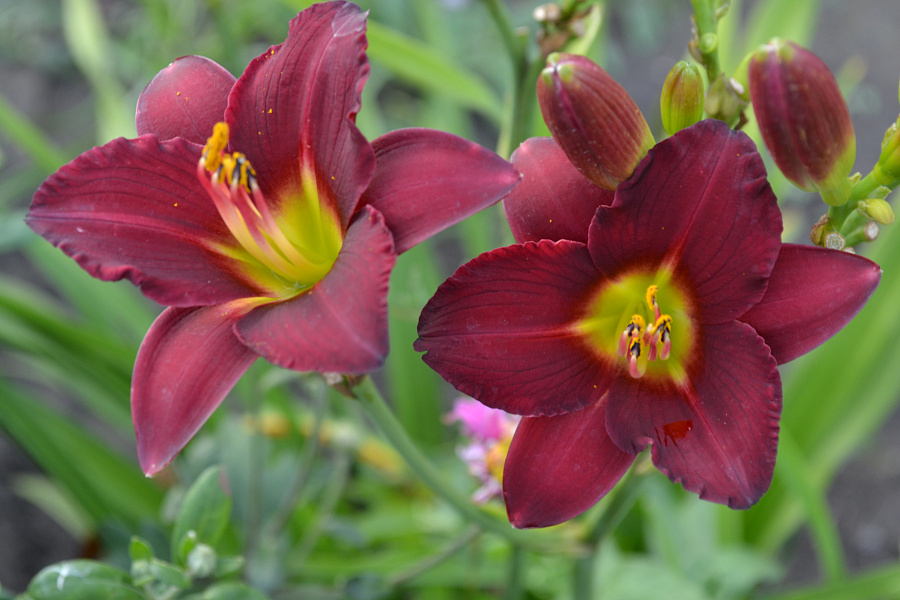• Окраска цветка : темно-бордовый с зеленым горлом,повторное цветение