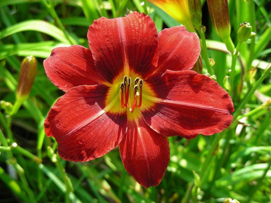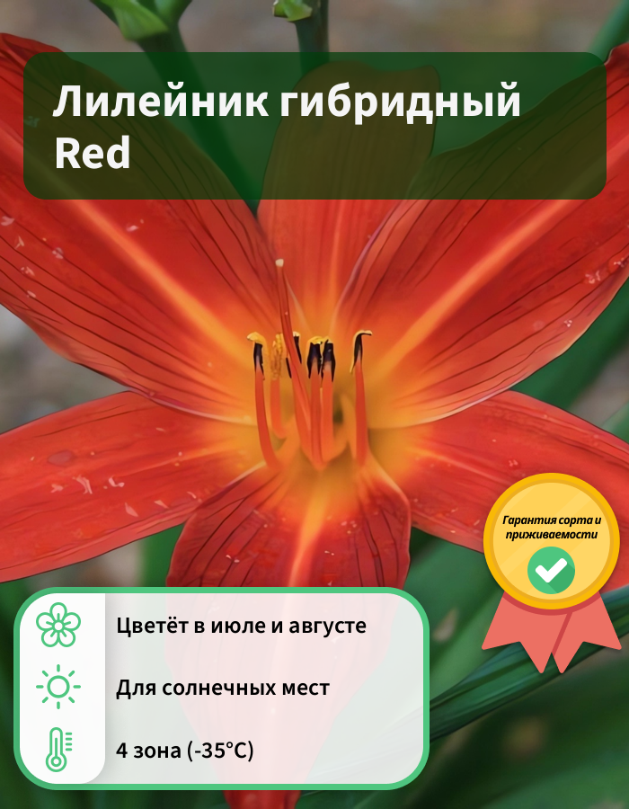 Саженцы Лилейника Гибридного Рэд (Red Hemerocallis) хорошо будут смотреться и на дачном участке, и на городской клумбе. Этот цветок занимает достаточно много места, при правильном уходе и соблюдении общих рекомендаций по агротехнике сохраняет декоративность не только в период цветения (с июля по август). Пышная и густая прикорневая листва создает оригинальное оформление для любых клумб. В высоту куст может достигать 50-70 сантиметров, в ширину нередко разрастается до 70-80 сантиметров. Цветоносы с яркими кирпично-красными бутонами возвышаются над зеленой массой и могут достигать 1 метра.