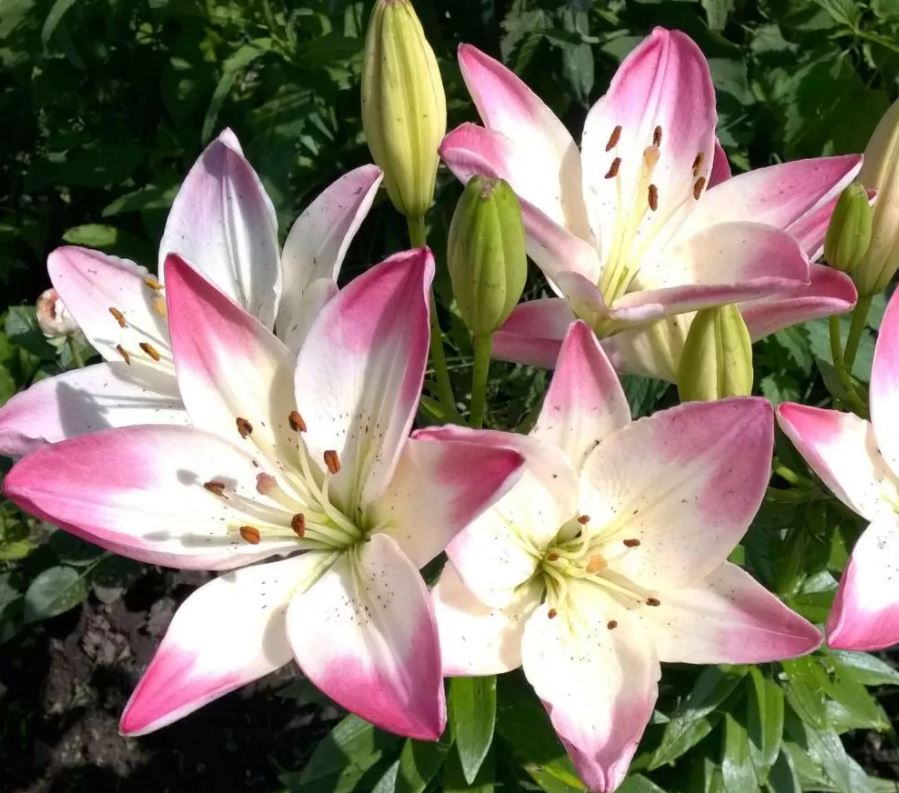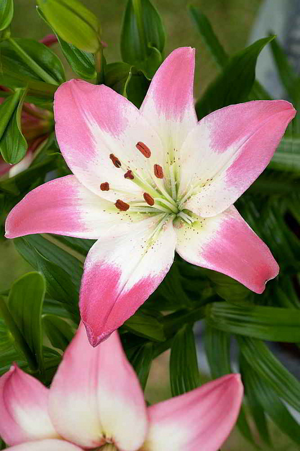 • Окраска цветка : кремово-белый центр, нежно-розовые края лепестков, темно-бордовые пыльники