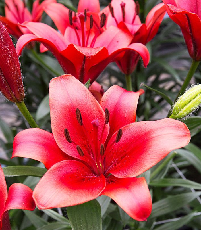 Саженцы и рассада лилии азиатской Солфарино (Lilium asiatic Solfarino) во время цветения внесут в палитру вашего сада красочные акценты. Красно-малиновые глянцевые лепестки с вишневыми прожилками и пурпурным крапом великолепно смотрятся на фоне сочной летней зелени. Этот сорт красив как в одиночных посадках, так и в групповых ландшафтных композициях.