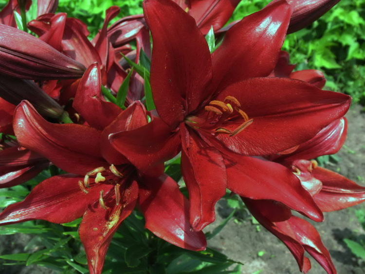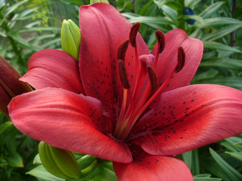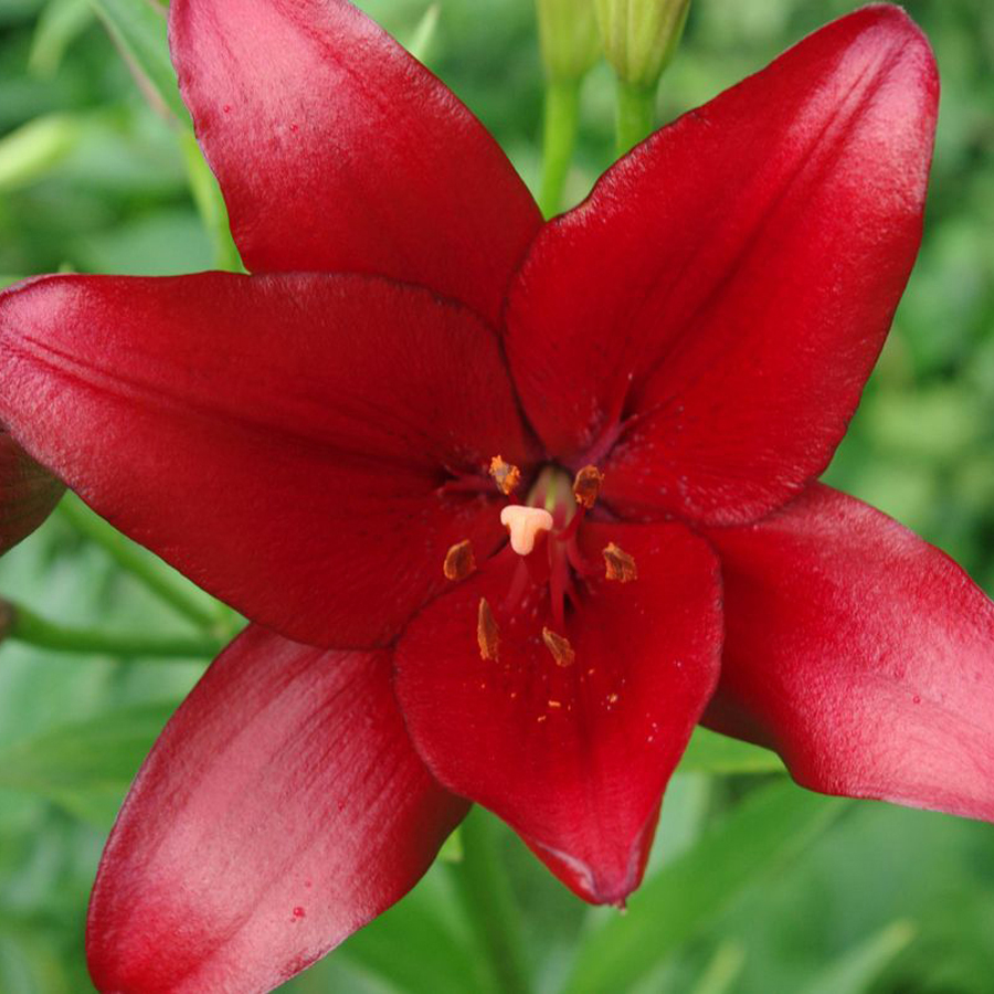 Окраска цветка : красный, глянцевый, пыльники оранжевые