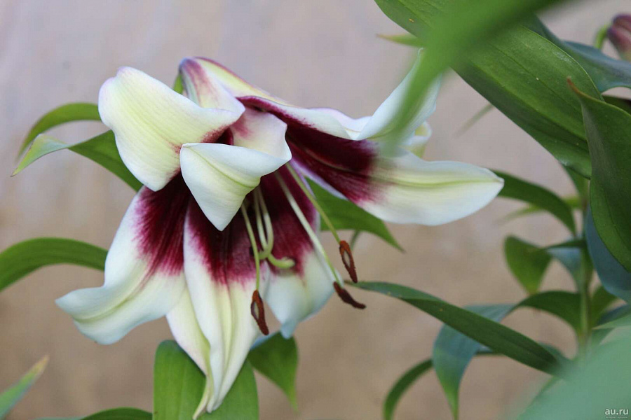 Окраска цветка : белый с пурпурно-бордовым пятном в центре
