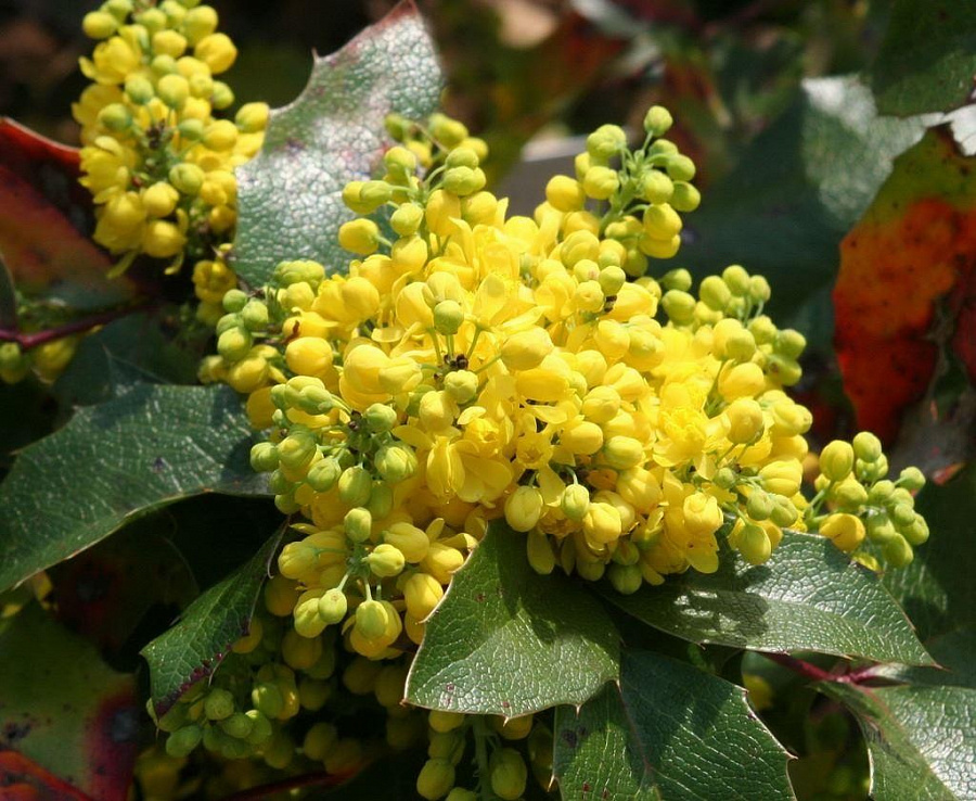 Магония падуболистная Аполло (Apollo) – это компактный кустарник шириной и высотой 60-100 см.Саженцы отлично смотрятся в качестве почвопокровного кустарника в групповых посадках. Растение образует вечнозеленый коврик с темными зелеными листочками, которые к осени становятся красно-золотистыми с бронзовым оттенком. Крупномеры предпочитают плодородные свежие почвы, хорошо реагируют на внесение органики. В начале мая радует появлением крупных соцветий с мелкими желтенькими цветочками. Магония падуболистная Аполло светолюбива, но неплохо растет и в тени. В августе появляются съедобные темно-синие ягодки.Они имеют характерный кисло-сладкий вкус. Обрезки практически никогда не требует