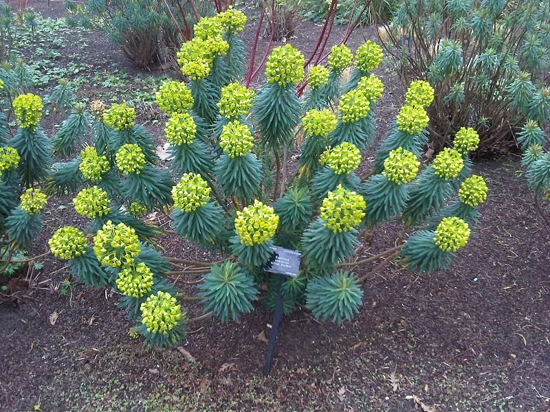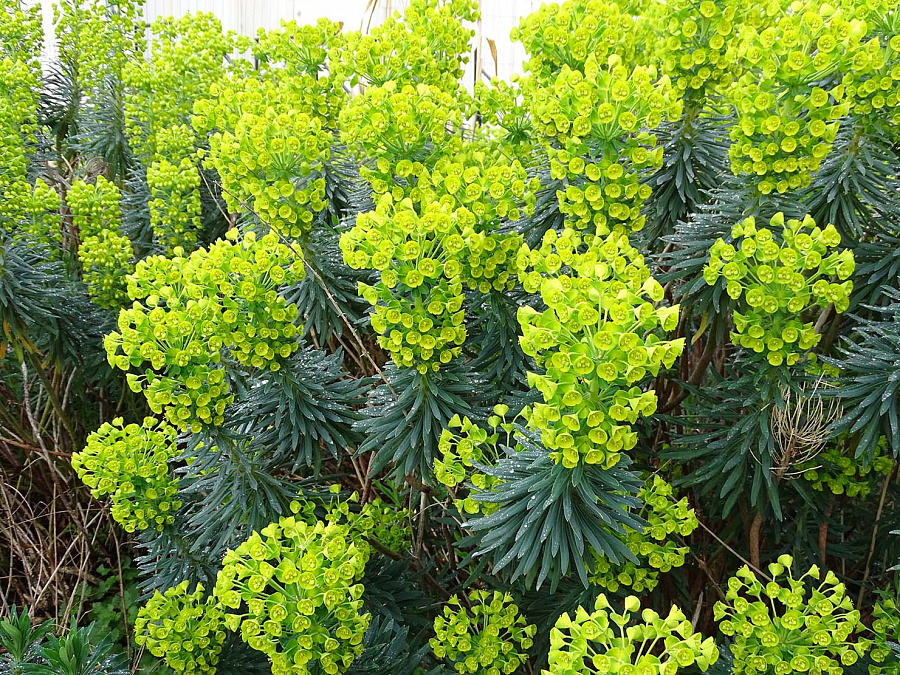 Рассада молочая Вульфена (Euphorbia griffithii) хорошо растет на открытых солнечных местах. Растение неплохо себя чувствует и в полутени, но в таком случае будет цвести не так обильно. Сорт прекрасно переносит засуху, полив потребуется лишь в том случае, если лето выдалось жарким и сухим. Высота молочая Вульфена доходит до 100–150 см. Листья с кремовой и желтой каймой. Цветы имеют необычную форму и салатово-желтый оттенок. Цветение длится с мая до июня. Используют многолетник чаще всего в групповых посадках среди газона или вдоль забора, дома, беседки. Реже можно встретить молочай с другими растениями.