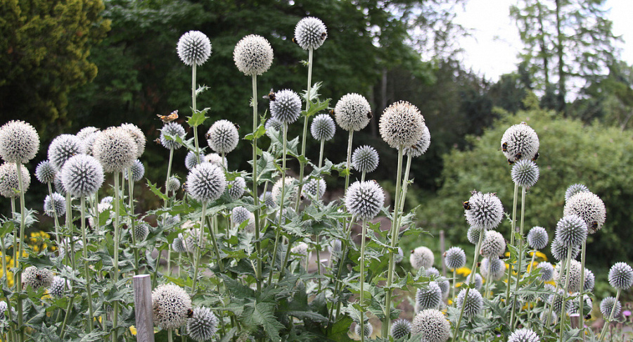 Саженцы Мордовника Банатского Арктик Глов (Arctic Glow ECHINOPS bannaticus) прекрасно впишутся в необычный ландшафтный дизайн загородного дома, он удачно будет смотреться рядом с альпийскими горками, различными каменистыми садиками, вдоль заборов и при оформлении стен разных строений. Это среднерослый кустарник, его высота не превышает 80-90 сантиметров, боковые стебли хорошо развиты, сильно выступают в стороны, диаметр растения может достигать 70-90 сантиметров. Соцветия шаровидные, серо-зеленые, диаметром до 5-7 сантиметров, полностью покрыты мелкими белыми цветами.