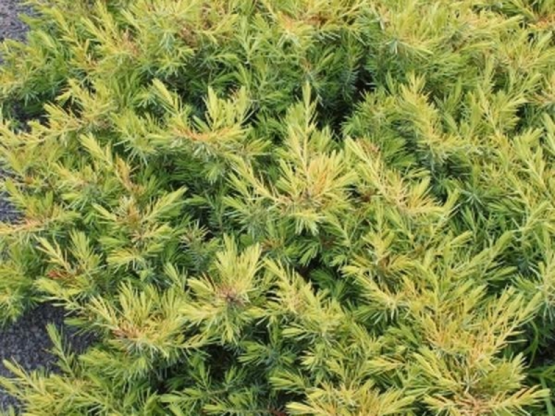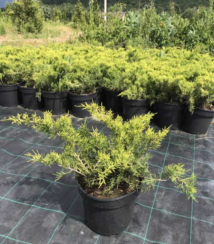 Саженцы можжевельника прибрежного Олл Голд (All gold) отлично подойдут для различных контрастных композиций, укрепления склонов и подавления сорняков. Высота растения — до 20 см, диаметр — 1-2 м. Хвоя жёлто-зелёная, молодые побеги — золотисто-жёлтые, долго сохраняют этот цвет. Морозоустойчивость -26 °C и больше. Этот сорт предпочитает хорошо дренированные и умеренно влажные почвы, но выживает практически на любых. Теневынослив, но при отсутствии прямого солнца теряет свой декоративный окрас. Возможно контейнерное содержание и высадка можжевельника Олл Голд в форме крупномеров.