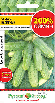 Семена огурцов "Надежный" высеваю прямо в грунт или выращивают через рассаду. Для второго способа используют различные питательные смеси. Сорт раннеспелый. Собирать урожай можно через 38-44 дней после появления всходов. Растение получается длинноплетистое. Плоды в длину достигают 10-11 см, а масса их варьируется от 80 до 125 грамм. Урожай крупнобугорчатый, хрустящий, горечи нет. Раннее формирование плодов позволяет получить основной урожай до начала болезней. Используются плоды из семян огурцов "Надежный" в свежем виде и для консервации.