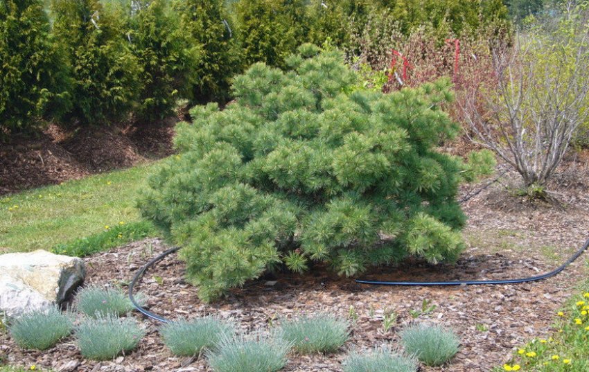 Саженцы сосны Веймутова Блю Шег (Blue Shag): декоративные шаровидные кроны карликового кустарника прямо светятся серебристо-зеленой хвоей. Габариты взрослого крупномера - до 1,5 м ширины и до 1,2 м высоты. Компактность сосны Веймутова Блю Шег позволяет использовать сорт в любых ландшафтных комбинациях. Хвоя очень длинная и мягкая, с синеватым отливом, растет пучками по 5 штук. Шишки длинные, конической формы, бледно-бурого оттенка.