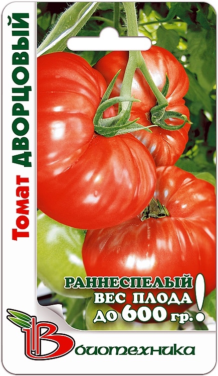 Семена томата "Дворцовый" (Dvortcovyj) – это раннеспелый сорт высоких мощных культур. Посев на рассаду производят в конце марта – апреля. Культура тепло- и светолюбивая. Высаживают всходы в открытый грунт через 50-60 дней. Куст высотой 120 см. Плоды созревают красные, плоскоокруглой формы, слегка ребристые. Мякоть сочная, мясистая, обладает высокими вкусовыми качествами. Средняя масса может достигать до 600 г. Сорт характеризуется длительным периодом плодоношения и хорошей урожайностью (до 8 кг с 1 кв. м). Плоды универсальны в использовании, подходят для потребления в свежем виде и консервации.