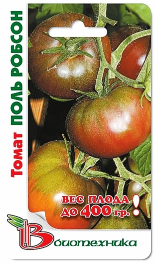 Семена томата "Поль Робсон" (Paul Robson) – это среднеспелый высокоурожайный сорт. Куст высокий, умеренно раскидистый. Урожайность сорта хорошая. Плоды крупные, мясистые, массой 250-300 грамм. Форма плоскоокруглая, с выраженной ребристостью у плодоножки. В процессе созревания цвет меняется с зеленого на красновато-коричневый, со слегка шоколадным отливом. Тонкая и плотная кожица предохраняет помидорки от растрескивания. Мякоть умеренно сочная, с малым количеством семян. Вкус приятный, насыщенно-сладкий, не водянистый.