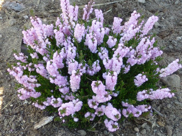 Саженцы вереска обыкновенного Раднор (Radnor) любимы ландшафтными дизайнерами за компактный размер и пышное раннее цветение. Растение образует раскидистый кустик высотой 25 сантиметров и шириной до 40 сантиметров. Уже в августе побеги покрываются довольно крупными (до 1,5 сантиметров) махровыми цветочками нежного бледно-розово-сиреневого оттенка. Цветущий кустик похож на пенное облачко, издающее терпкий медовый аромат.