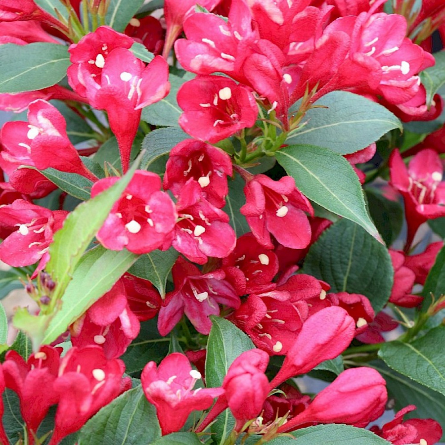 Вейгела гибридная "Олл Саммэ Ред" - это великолепное растение с ярко-красными цветками, которое порадует вас своим великолепием на протяжении двух месяцев в году. Ее ствол прочный и устойчивый, а размеры растения позволяют разместить его как в саду, так и на террасе или балконе. Листья вейгелы имеют интересную форму и придают растению особый шарм.