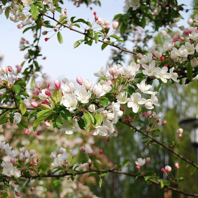 Саженцы яблони декоративной Профессор Шпренгер (Professor Sprenger) имеют красивую узкопирамидальную форму кроны. Само деревце вырастает до 4 метров. Цветет в мае обильно, цветками до 4 сантиметров в диаметре. При распускании бутона лепестки имеют розовую окраску, которая постепенно бледнеет до светло-розовой или белой. Цветение ароматное.